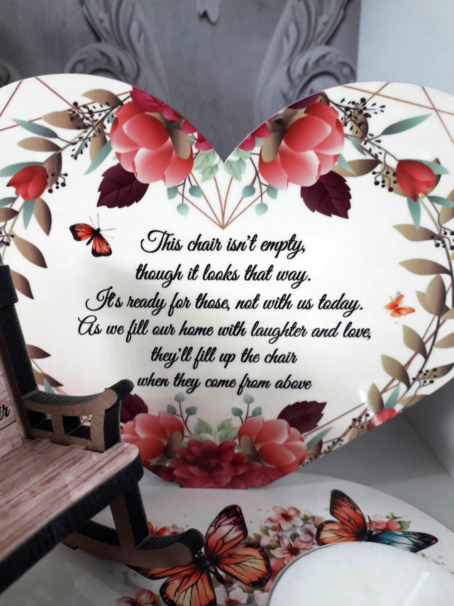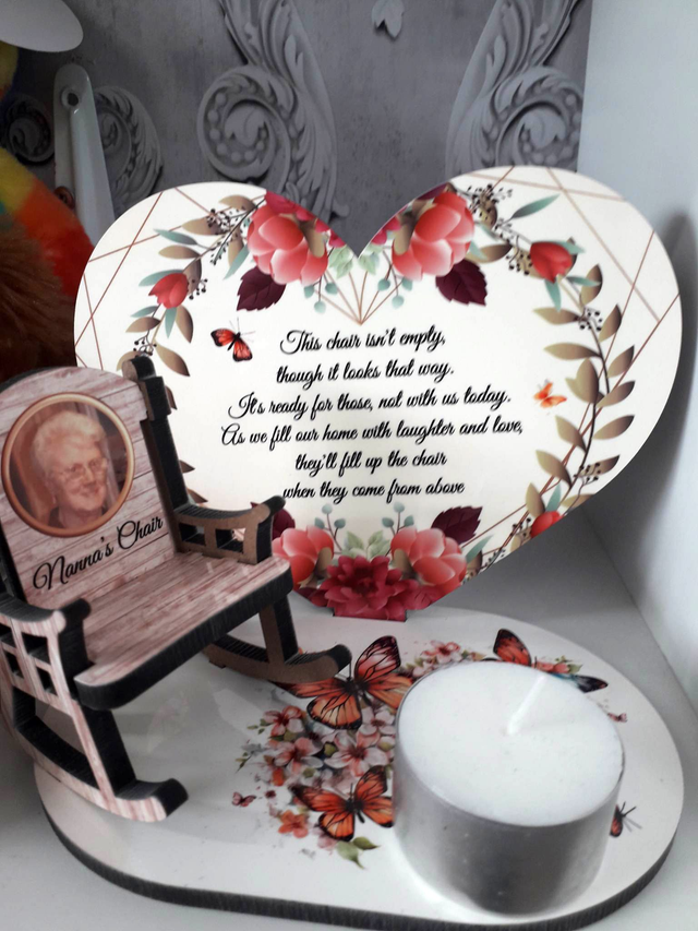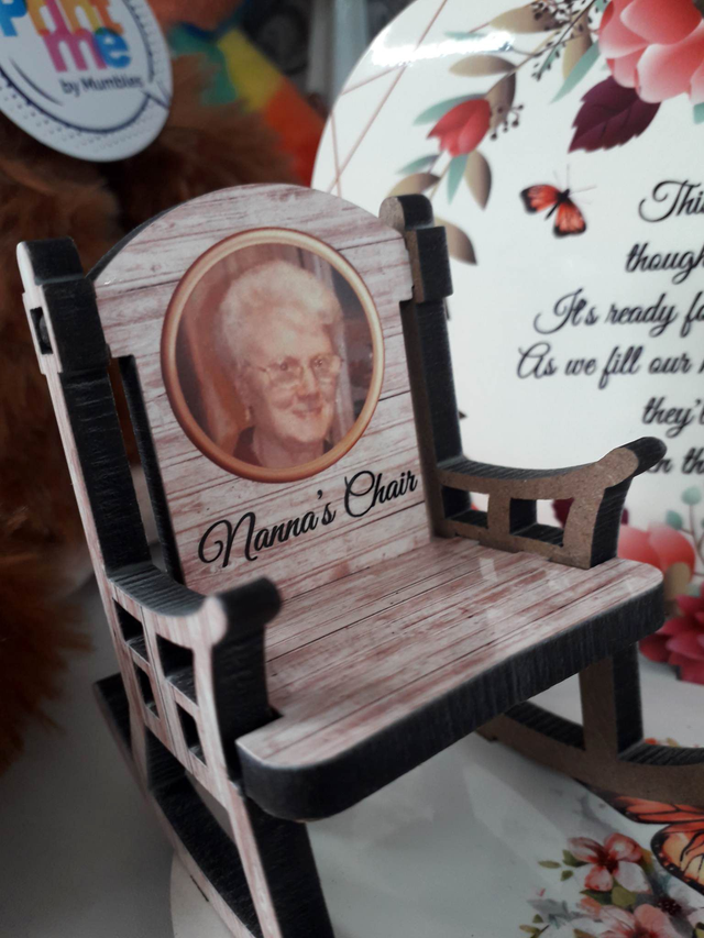The memorial chair is something which can bring comfort. All can be changed so you can have different wording. The design can be personalised just for you and the loved one you are missing. Once ordered I will email you for a photo and also what wording etc you would like.